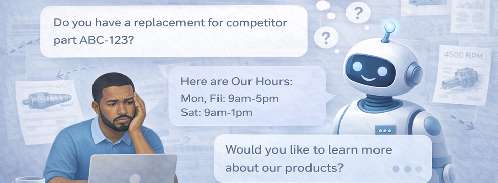 You've tried chatbots. They work great for simple questions like "what are your hours?" But B2B buyers ask complex questions: "What's the difference between model X and model Y for high-temperature applications?" or "Do you have a replacement for competitor part #ABC-123?" Traditional chatbots hit a wall. They can't understand technical language, access your product specs, or give answers that actually help.