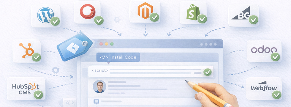 Installs on any website with a single line of code via Google Tag Manager. Works with WordPress, Magento, Shopify, BigCommerce, Odoo, Sitecore, HubSpot CMS, Webflow, and custom platforms.