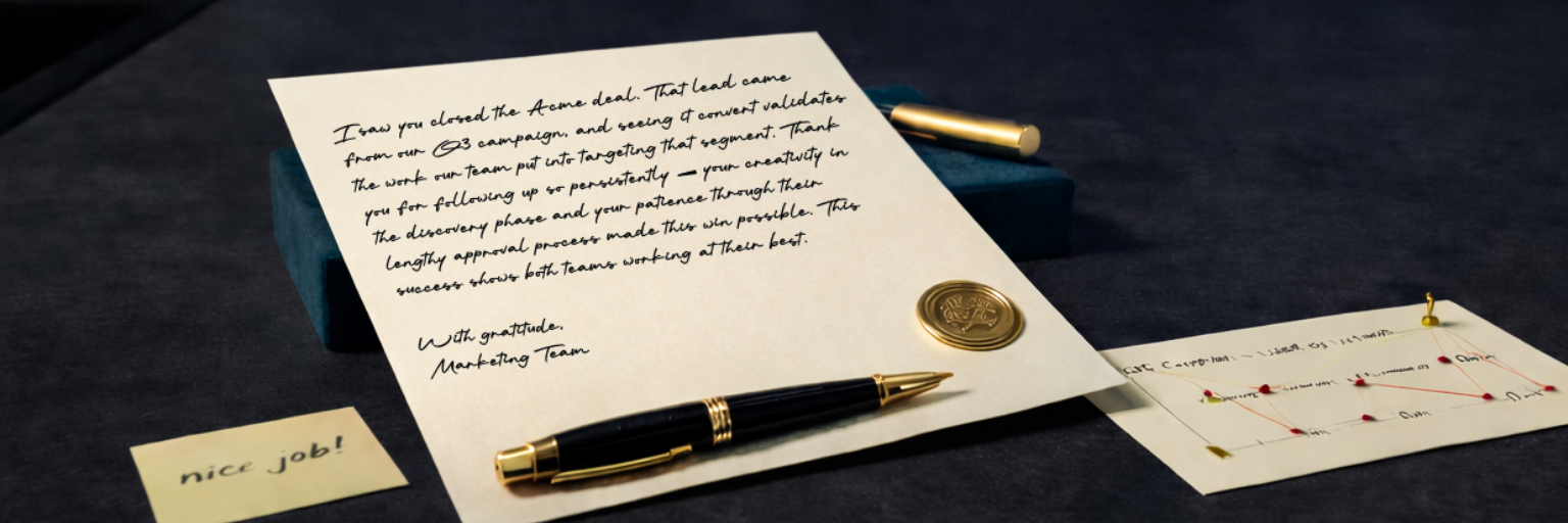 Appreciation takes more effort. It requires knowing the context, understanding the connection between marketing activity and sales result, and expressing genuine gratitude rather than perfunctory acknowledgment.