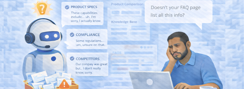 So your chatbot launches half-trained. It knows your company name and maybe your top three products. It doesn't know the technical specifications that matter to engineers. It doesn't understand the compliance requirements that matter to procurement. It can't explain why your solution beats the competitor your prospect is also evaluating.